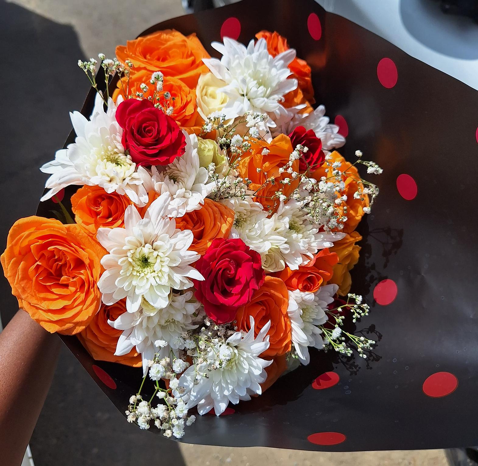 This exquisite bouquet is crafted from a selection of fresh, seasonal flowers, expertly arranged to create a stunning visual display. Perfect for gifting or brightening your own space, this bouquet adds a touch of elegance and cheer to any setting. Each flower is chosen for its quality and beauty, ensuring a long-lasting arrangement that captures the essence of nature's bounty. Ideal for celebrations, special occasions, or simply to express love and appreciation, this bouquet is a timeless gift that speaks from the heart.